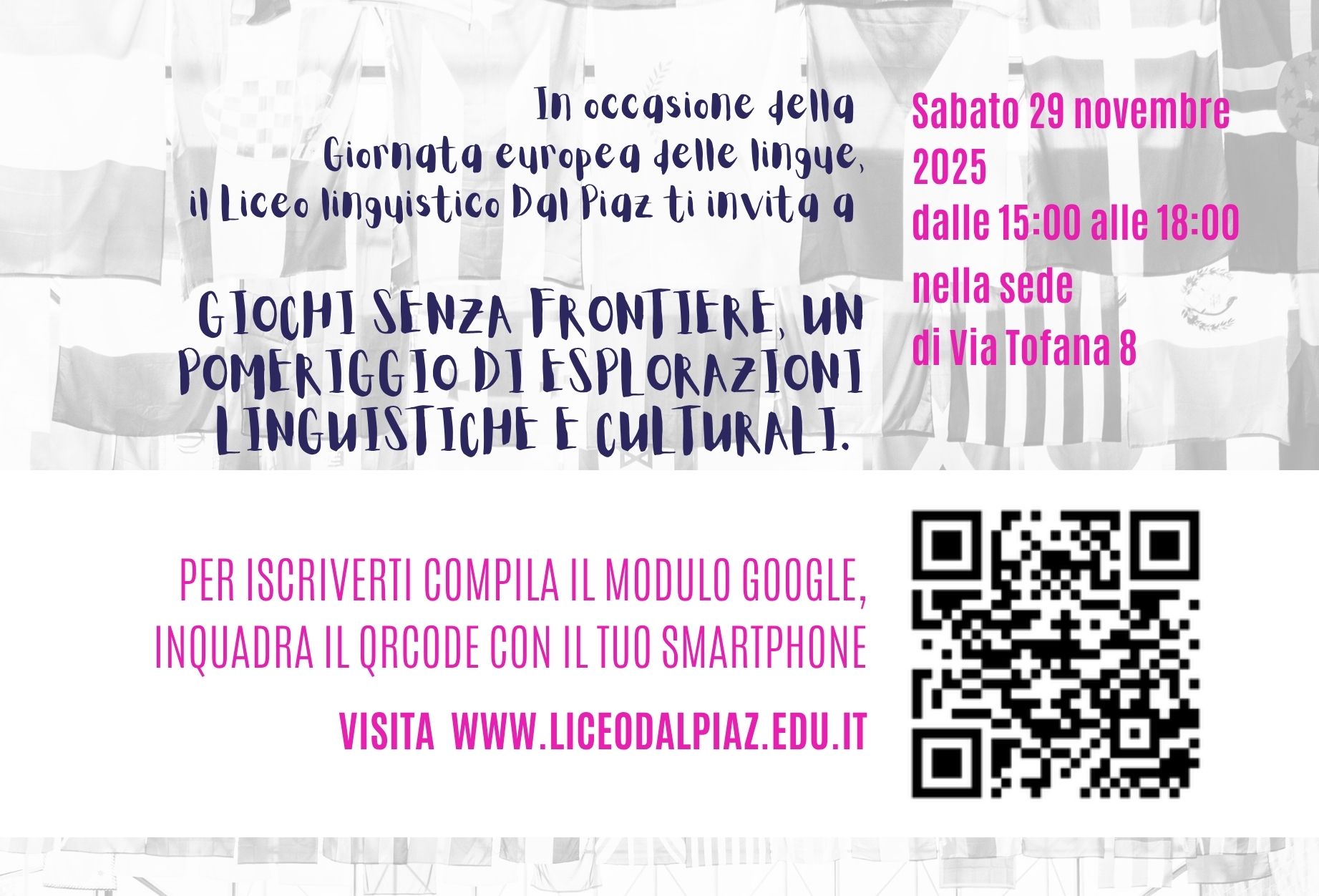 Il Liceo Dal Piaz – indirizzo linguistico – organizza il 29 novembre “Giochi senza frontiere”, un pomeriggio di attività e laboratori dedicati al plurilinguismo.